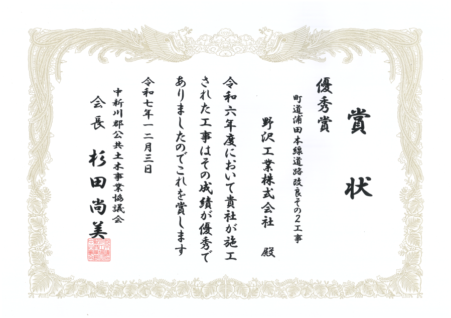 令和7年度立山土木事務所管内優良土木工事表彰にて、